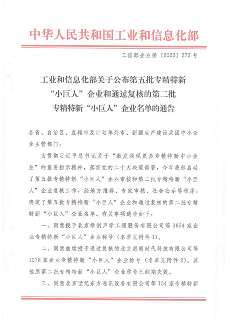 為貫徹習近平總書記關于“激發(fā)涌現(xiàn)更多專精特新中小企業(yè)”的重要指示精神,落實黨的二十大決策部署,工業(yè)和信息化部啟動了第五批專精特新“小巨人”企業(yè)審核的工作,我公司榮獲第五批專精特新“小巨人”稱號。